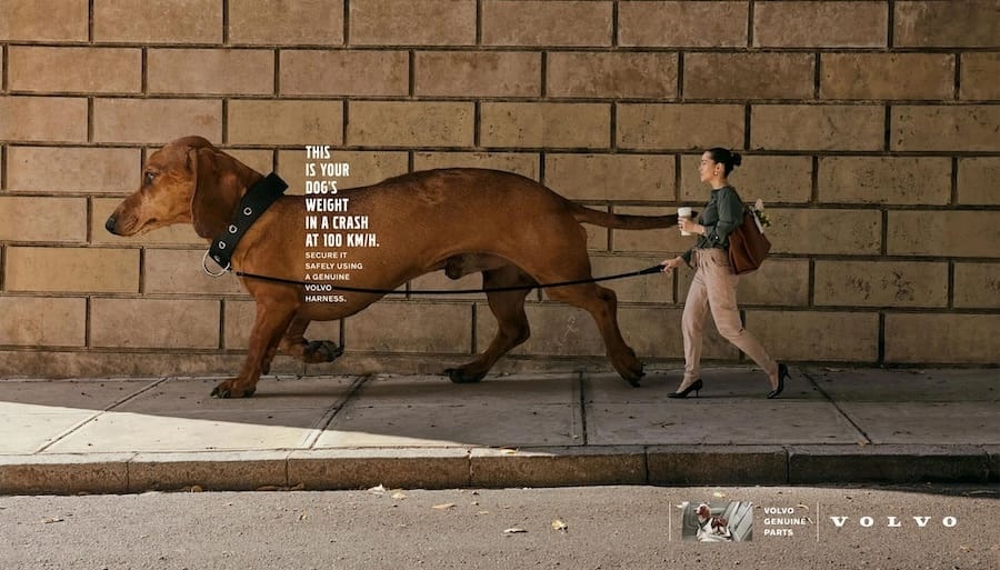 What’s happening: A woman casually strolls with a comically oversized dachshund, representing its effective weight in a 100 km/h crash, urging owners to secure pets with a Volvo harness.