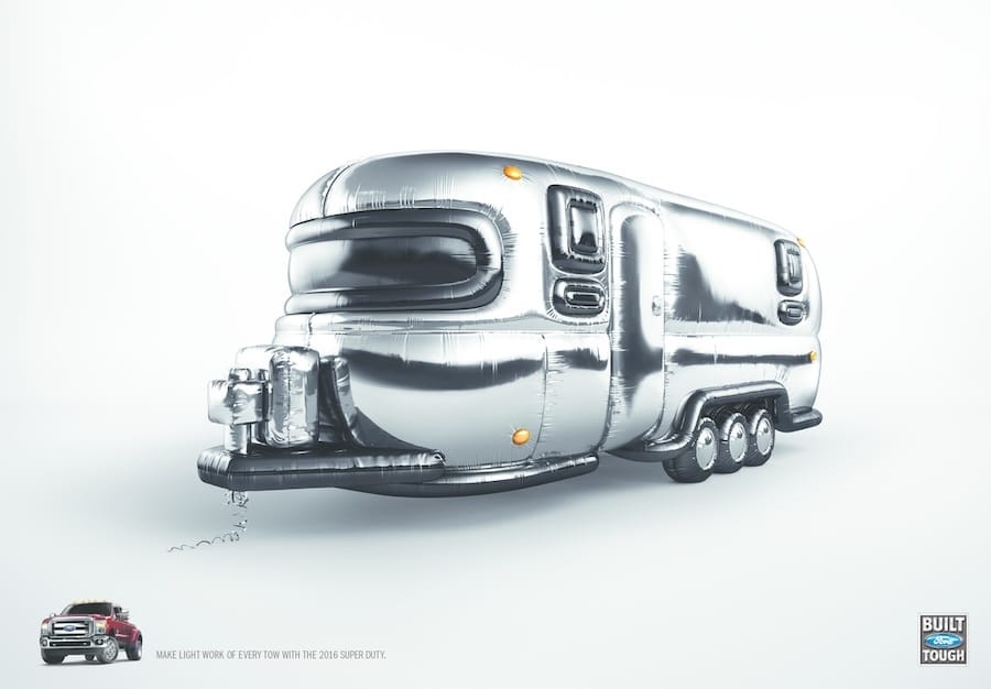 What’s happening: This ad features a huge Airstream-style trailer made into a shiny helium balloon, tethered by a tiny string to a Ford Super Duty truck. It hilariously implies that towing this hefty load feels like nothing.