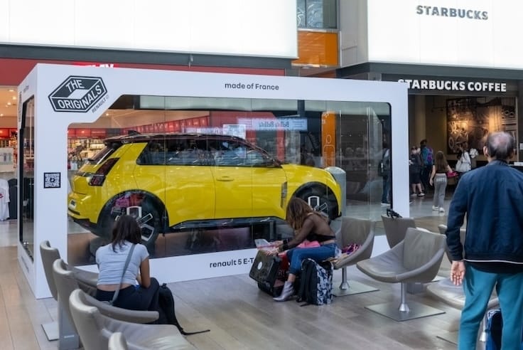 What’s happening: A vibrant yellow Renault electric car takes center stage in a glass box, attracting eyes in a bustling public space, complete with lounge seating and a Starbucks backdrop.