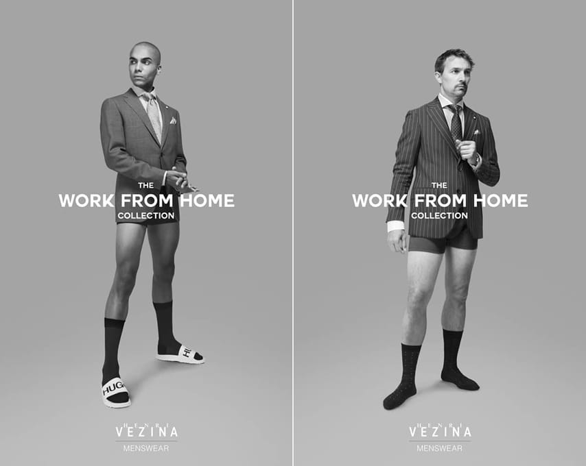 What’s happening: Two dapper gents are perfectly suited for a video call from the waist up, but it's all undies and socks from the waist down. It's Vezina Menswear's relatable "Work From Home Collection."