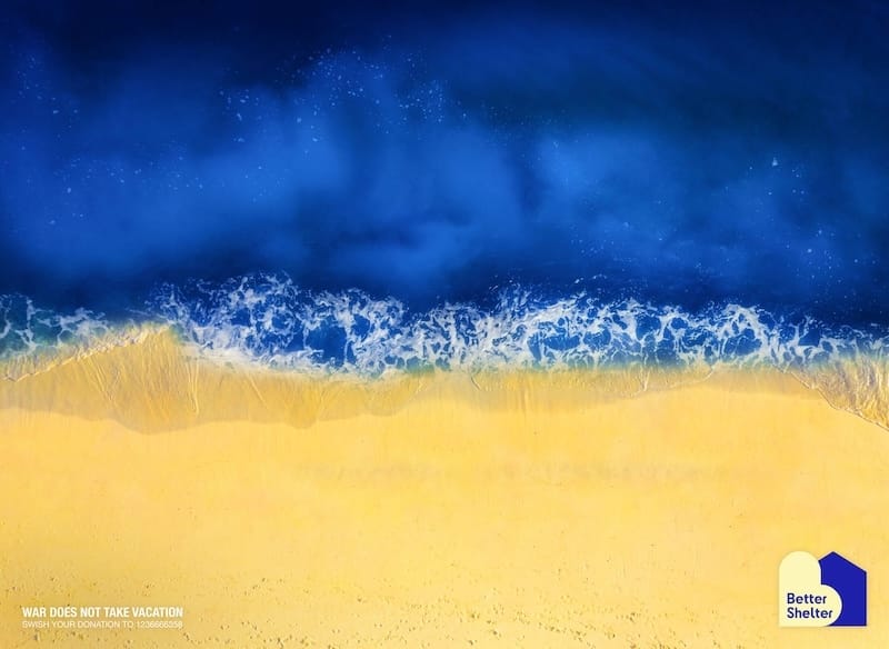 What’s happening: Blue ocean waves crash onto a yellow sandy beach, vividly mirroring the Ukrainian flag. Bold text declares, "WAR DOES NOT TAKE VACATION," as Better Shelter seeks donations.