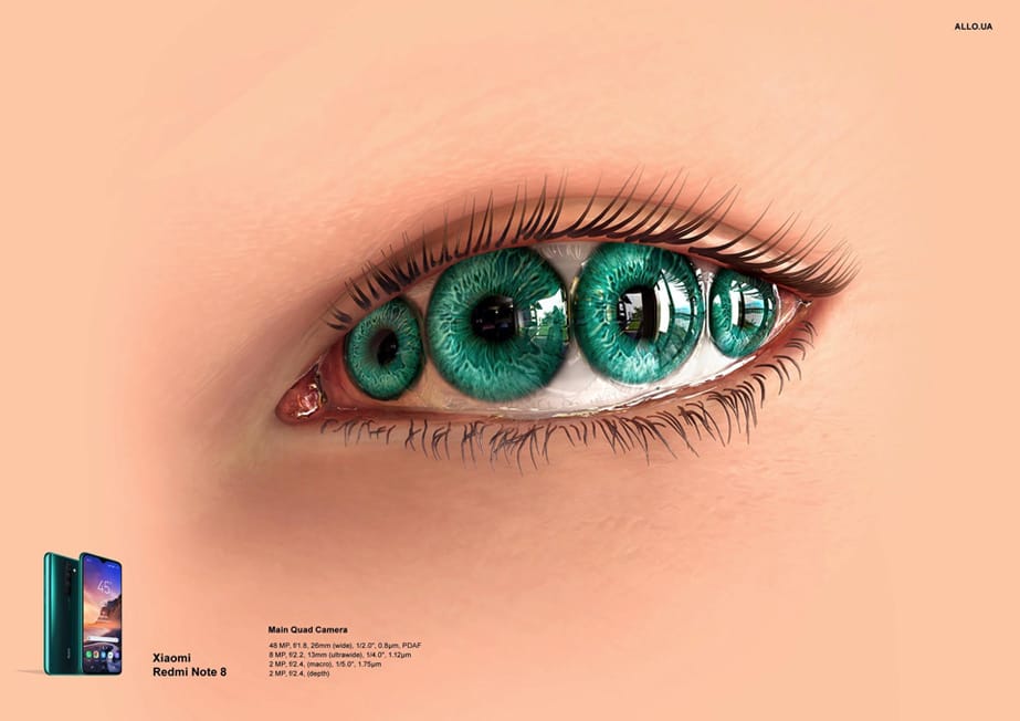 What’s happening: An eye with four vibrant green pupils visually demonstrates Xiaomi's Redmi Note 8 quad-camera system. Each "eye" symbolizes a unique lens, capturing reflections of the world.