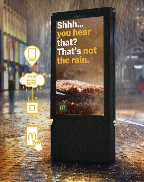 What’s happening: A McDonald's digital billboard displays a sizzling burger during a downpour. Using real-time weather data, it cheekily tells passersby that the distinctive sound isn't rain, but pure burger bliss.