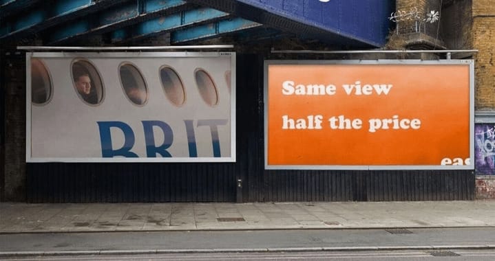 Why it’s awesome: This is guerrilla marketing gold! EasyJet masterfully leverages its rival's adjacent billboard to deliver a direct, devastating comparison. It's a simple, brilliant OOH stunt that perfectly spotlights their core differentiator.
