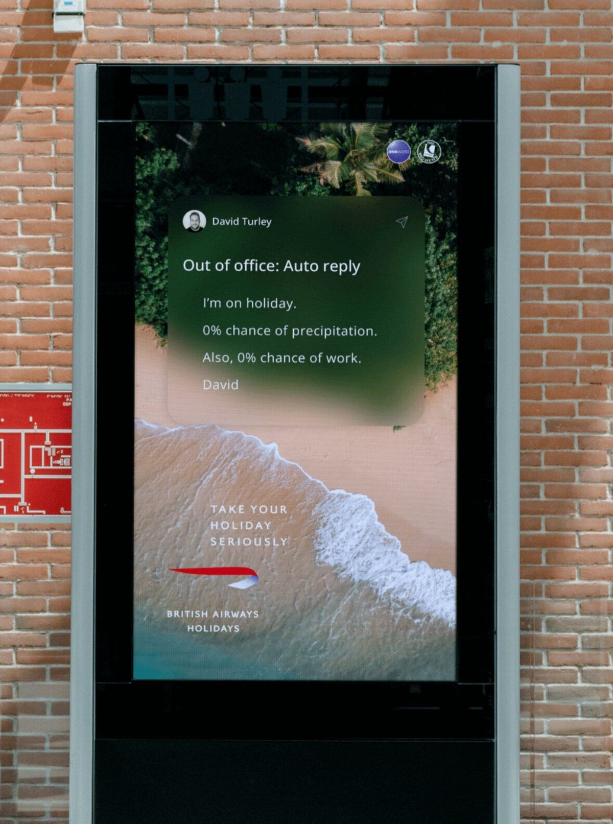 What’s happening: An auto-reply from "David Turley" declares he's on holiday with 0% chance of rain and work, set against a stunning beach. British Airways Holidays tells us to "Take Your Holiday Seriously."