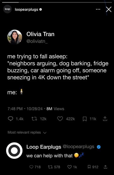 What’s happening: Olivia's dreading sleep thanks to every loud noise imaginable, including a "sneeze in 4K." Loop Earplugs swiftly swoop into her replies, perfectly pitching their product as the ultimate noise-canceling solution for a good night's rest.