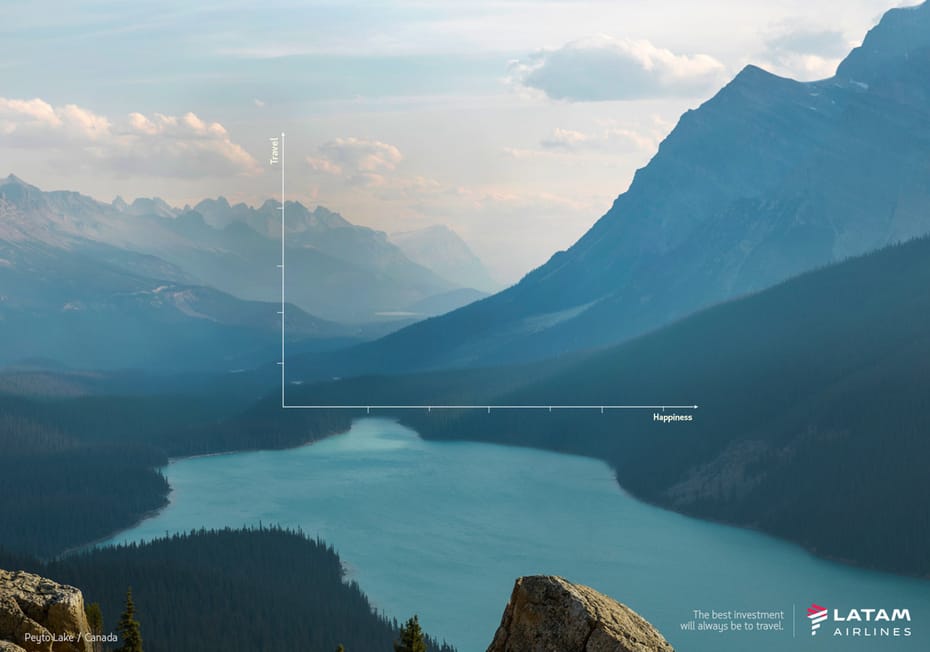 What’s happening: A breathtaking mountain and lake scene cleverly doubles as a graph, visually proving that more travel directly correlates with increased happiness, courtesy of LATAM Airlines.