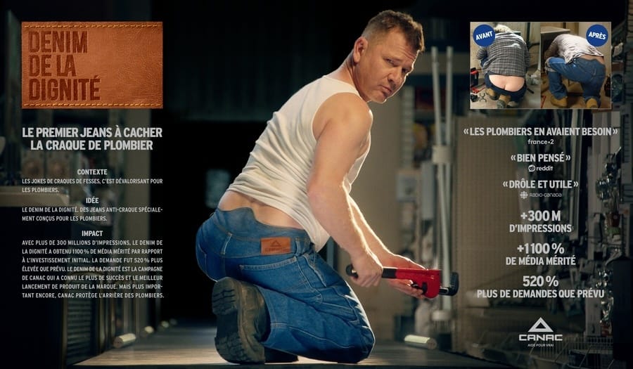 What’s happening: This ad introduces Canac's "Denim of Dignity" jeans, specifically designed for plumbers to prevent "plumber's crack." It hilariously showcases the "before and after" impact, celebrating dignity.