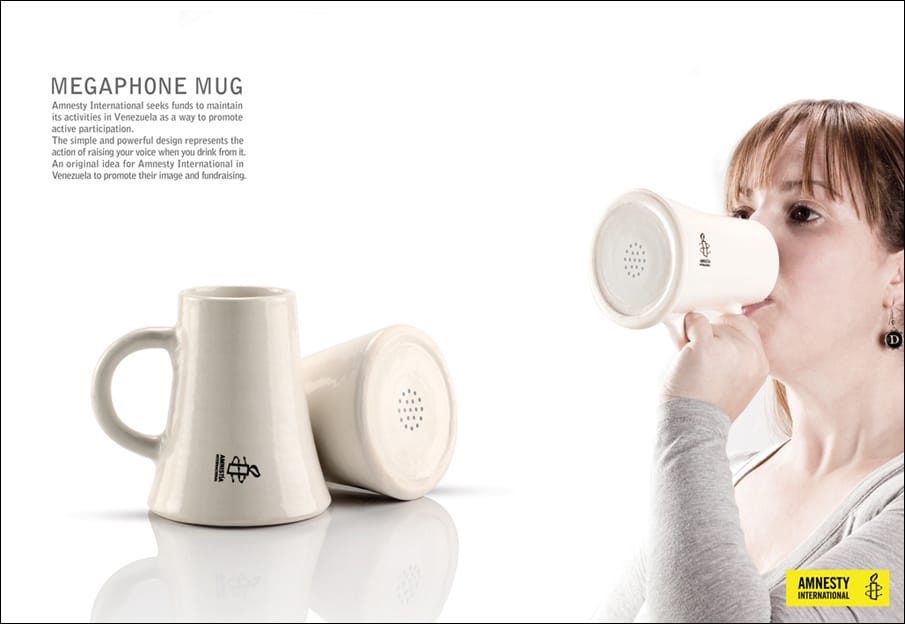 What’s happening: Amnesty International serves up megaphone-shaped mugs, urging active participation. A woman sips from one, visually linking daily rituals to their mission of raising voices for change.