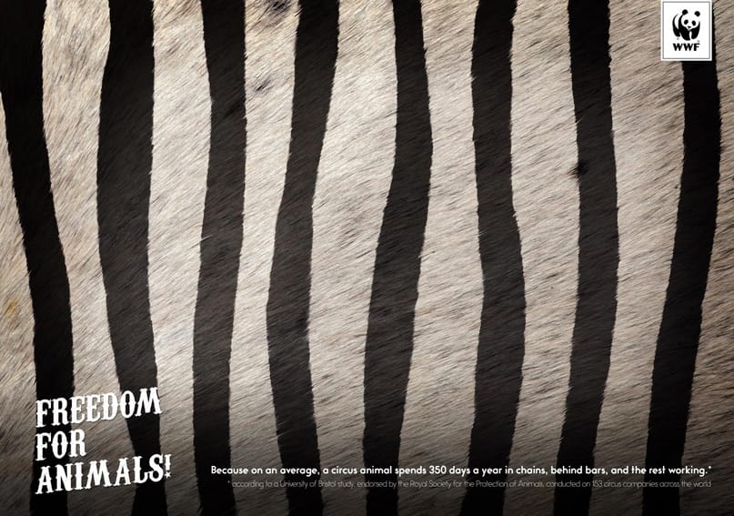 Whatâs happening: This poignant WWF ad uses zebra stripes as powerful visual metaphors for prison bars. It advocates for animal freedom, revealing circus animals endure 350 days yearly in chains and behind literal bars.