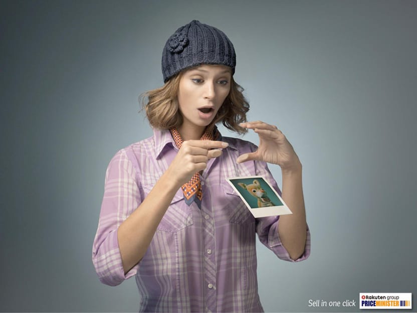 Whatâs happening: A woman's jaw drops as she seemingly conjures a physical photo into a digital listing with a flick of her wrist, demonstrating Priceminister's effortless "one-click" selling.