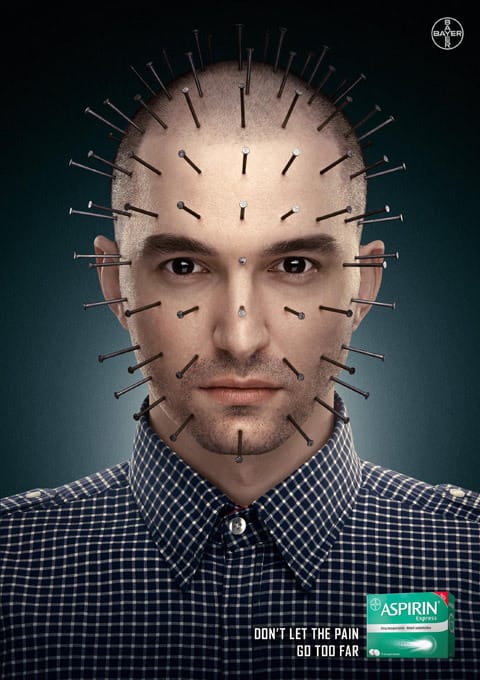 Why itâs awesome: The ad brilliantly visualizes extreme pain, making the abstract feeling of a headache physically jarring and unforgettable. It perfectly conveys Aspirin's role in stopping pain before it escalates.