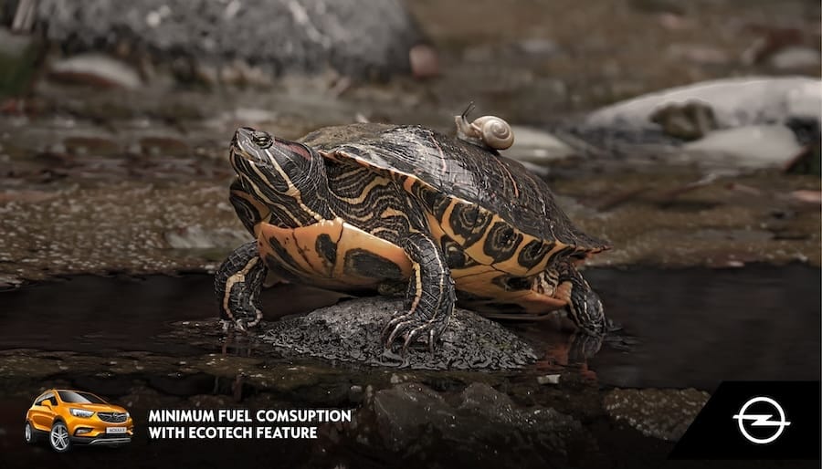 What’s happening: An Opel ad pairs a chill turtle and its snail passenger with text promoting "minimum fuel consumption" via the Ecotech feature, featuring the Mokka X.