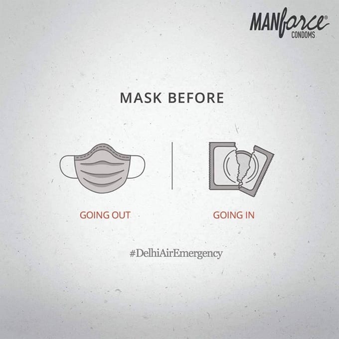 What’s happening: Manforce cleverly links wearing a face mask for Delhi's air pollution (#DelhiAirEmergency) to wearing a condom for sex. It's a witty call to "mask up" for protection, both outdoors and indoors.