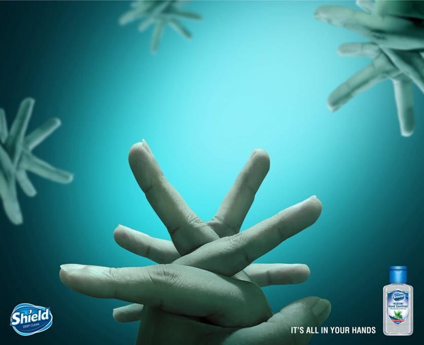 What’s happening: A tangle of human hands navigates a teal void, surrounded by ominous, blurred germ-like particles. Shield Hand Sanitizer offers the solution, playfully reminding us it’s all in our hands.