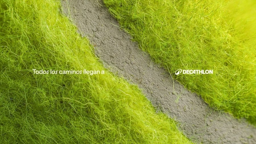 What’s happening: A vibrant close-up of a tennis ball's fuzzy green surface, where the white seam is cleverly portrayed as a winding road. Spanish text reads, "All roads lead to...", before the Decathlon logo.