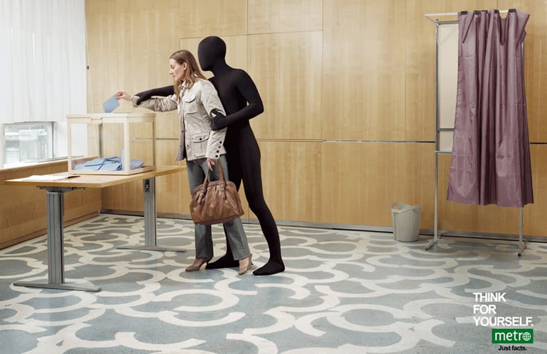 Why it’s awesome: This ad brilliantly visualizes the unseen forces that can sway public opinion. The anonymous black figure is a striking, unsettling metaphor for media bias, propaganda, or peer pressure.