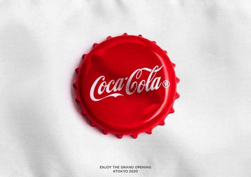 What’s happening: A glossy red Coca-Cola bottle cap sits prominently on a white textured background, with a crisp invitation to "ENJOY THE GRAND OPENING #TOKYO 2020" printed below.