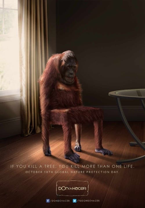 What’s happening: An orangutan is tragically fused into a living room chair, its sad eyes staring out. The ad powerfully illustrates how logging doesn't just fell trees; it brutally reshapes and destroys countless animal lives.