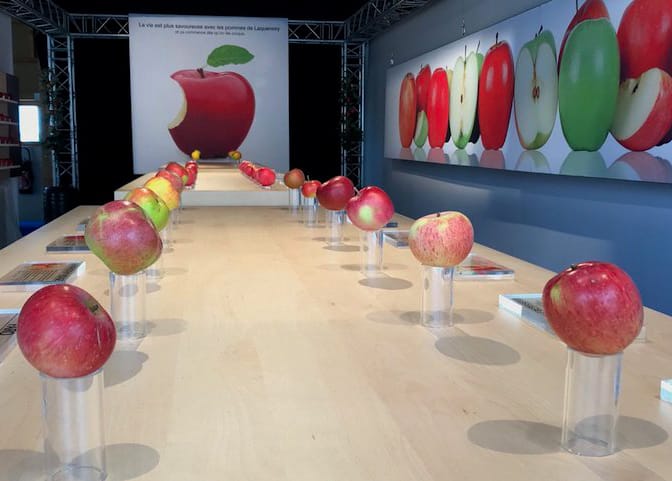 What’s happening: A vibrant apple display featuring real fruit on pedestals and massive posters. One boasts a bitten apple with French text, while another showcases various apple varieties, whole and sliced.