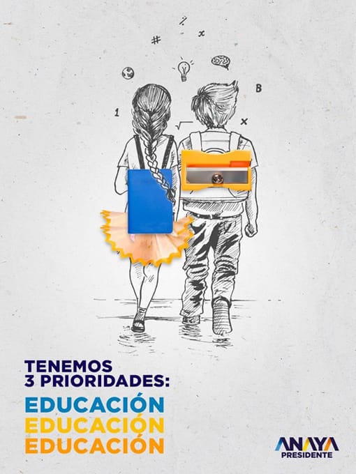 What’s happening: Two hand-drawn students sport real school supplies (a sharpener backpack, a pencil-shaving skirt!). Around them, math symbols float, as "Anaya Presidente" boldly declares "EDUCATION" his top three priorities.