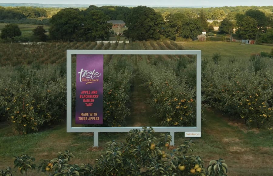 What’s happening: Sainsbury's literally puts a giant frame in an apple orchard, highlighting a "Taste the Difference" tart and proclaiming it's "MADE WITH THESE APPLES." Talk about a fresh perspective.