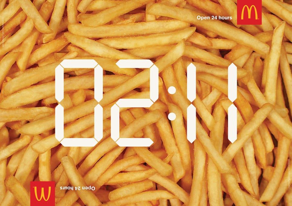 What’s happening: Stacks of golden McDonald's fries frame a digital clock reading 02:11, underscoring that hunger for fries strikes at any hour, and McDonald's is open.